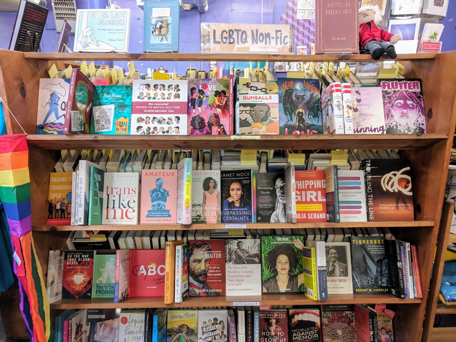Aside from the vibrant purple, which colors the store interior as well as exterior walls, Antigone Books was a wash of color, from an abundance of rainbow pride flags to strings of multicolored pennants, to furniture painted yellow and red. Now, decor does not a bookstore make—I've been just as excited about shops that looked like a bulldozer dumped some books in—but it was the decor of Antigone Books that made me want to stop and sit there more than the used bookshop down the street.
